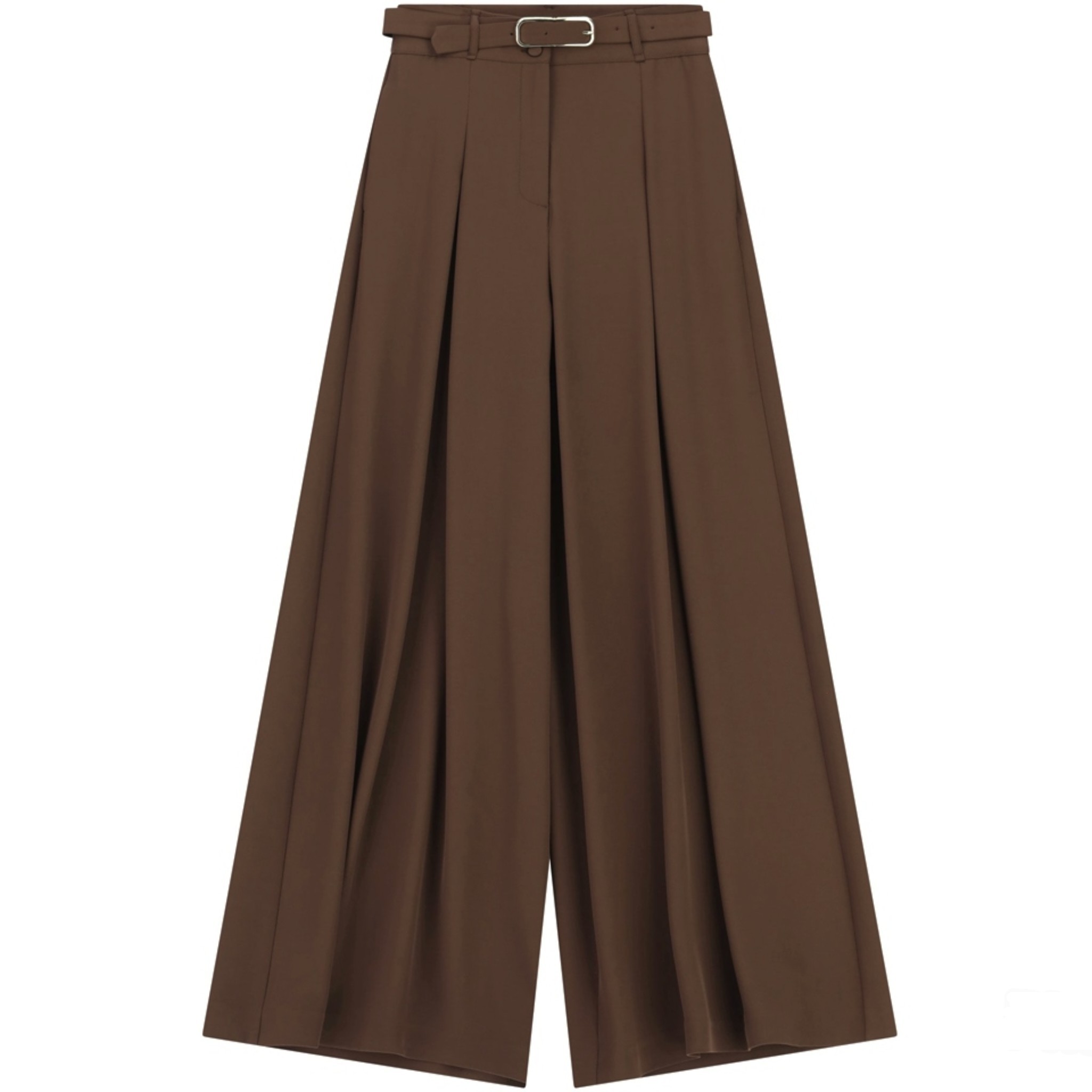 Nohavice palazzo Imperial s vysokým pásom, širokým strihom, prednými záhybmi a ladiacim opaskom. Štruktúrovaný strih zaisťuje voľnosť pohybu a sofistikovaný profil, ideálny na vytváranie výrazných outfitov, ktoré vyjadrujú osobný štýl v mestskom aj profesionálnom prostredí.