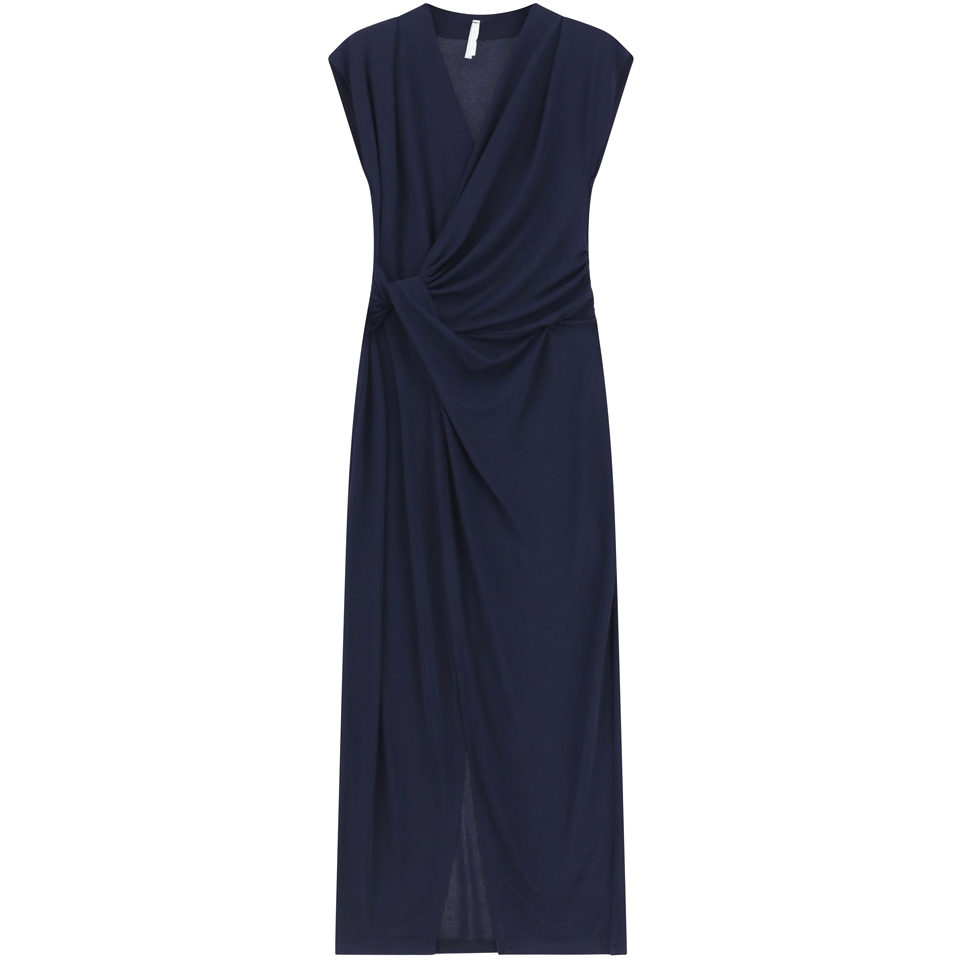 Predĺžená silueta týchto dlhých šiat Imperial bez rukávov sa vyznačuje rafinovaným bočným splývaním a hlbokým výstrihom do V. Zavinovací strih poskytuje voľnosť pohybu a lichotivý tvar, zatiaľ čo asymetrické detaily umožňujú výrazné a moderné kombinácie vhodné pre tie, ktoré hľadajú jedinečné možnosti šatníka.